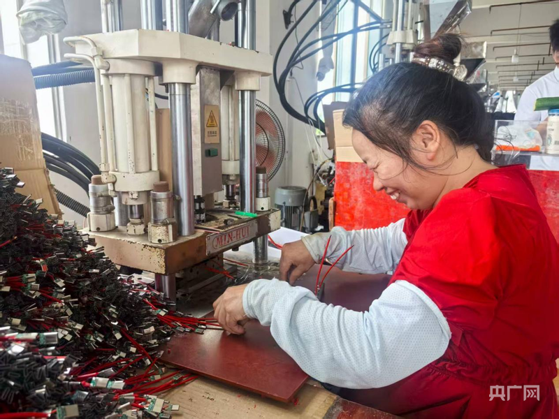 涔天河镇移民安置点数据线厂工人愉快地工作(央广网发 杨丁香摄)