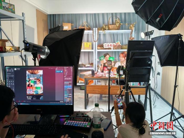 大学生在青创基地的直播间销售农特产品。(资料图) 何俊喆摄