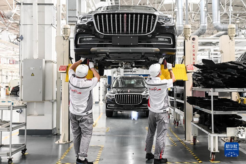 工人在位于吉林长春的一汽红旗工厂总装车间内装配车辆(2021年7月1日摄)。新华社记者 颜麟蕴 摄