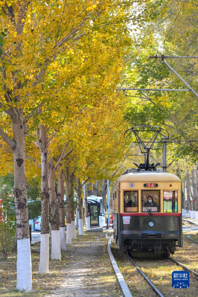 10月19日,在长春市春城大街,一辆电车行驶在轨道上。