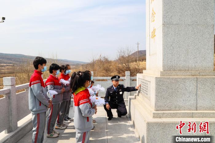 窦常龙在革命烈士纪念碑前为学生们讲述烈士事迹。(资料图) 檀洺摄