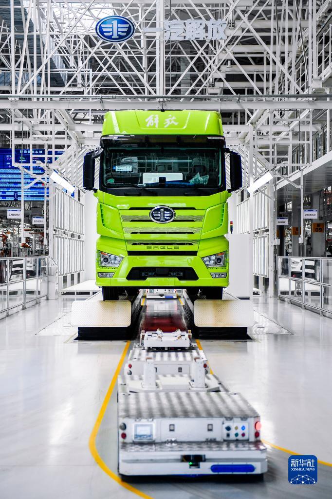 在位于吉林长春的一汽解放汽车有限公司,一台AGV行驶在J7智能工厂车间内(6月12日摄)。