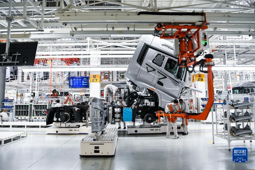 在位于吉林长春的一汽解放汽车有限公司J7智能工厂内,工人在AGV上装配车辆(6月12日摄)。