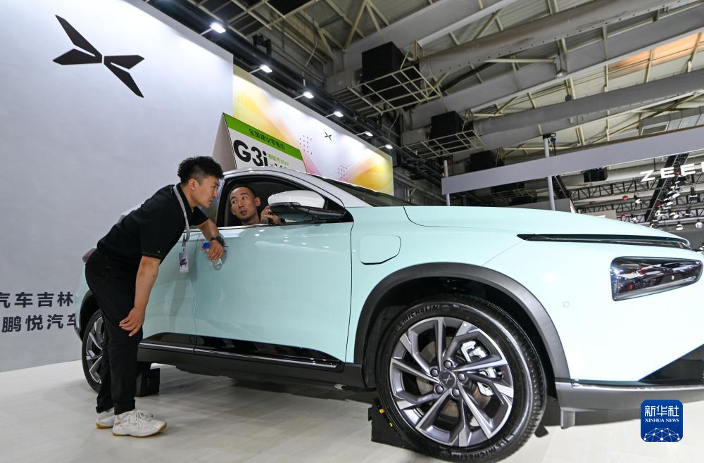 7月17日,一名参观者在长春汽博会小鹏汽车品牌展区体验一款汽车。