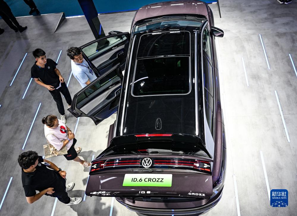 观众在长春汽博会的一汽-大众品牌展位上观看一款新能源汽车(7月20日摄)。