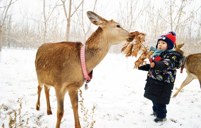 小朋友与梅花鹿互动。(东丰县委宣传部供图 张桂娟 摄)