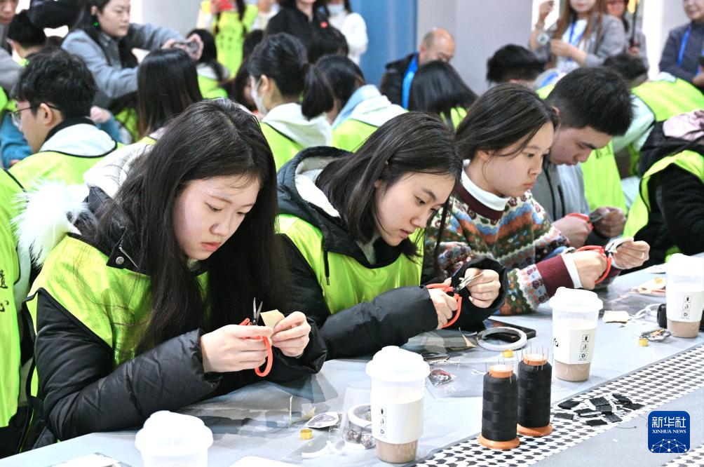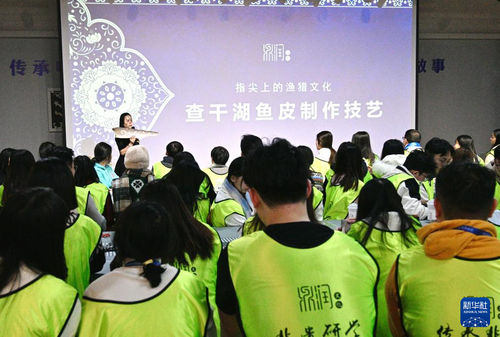 1月24日,冬令营营员在吉林省松原市鼎润文化创意产业园学习鱼皮制作技艺。