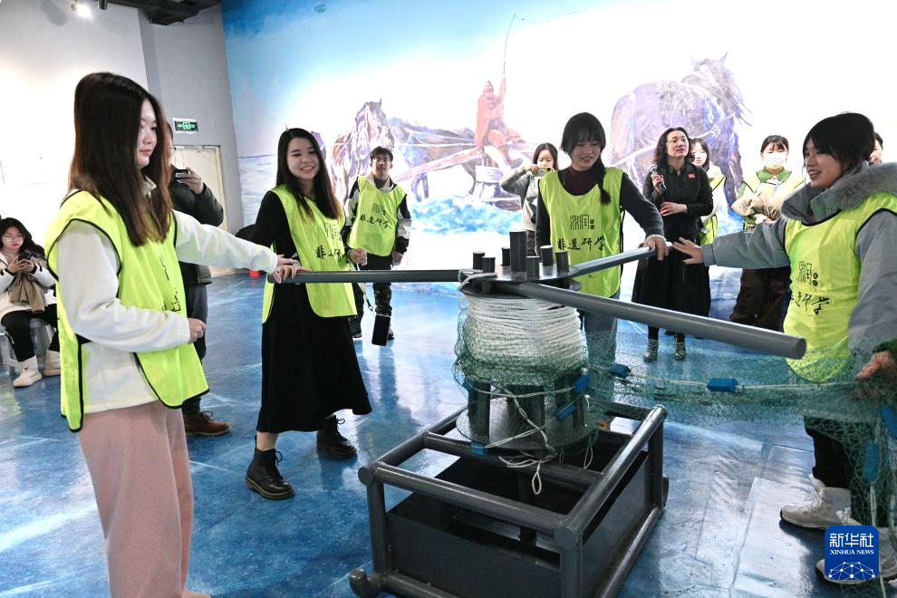 1月24日,冬令营营员在吉林省松原市鼎润文化创意产业园体验查干湖冬捕用的绞盘。