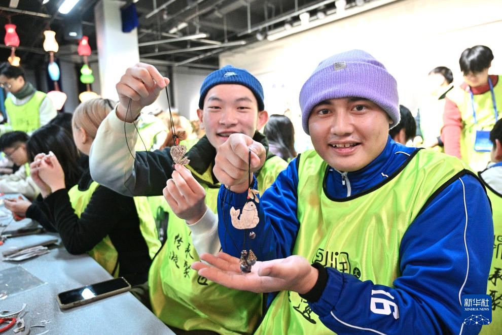 1月24日,冬令营营员罗正浩(右)和张畯在吉林省松原市鼎润文化创意产业园展示他们制作好的鱼皮项链。