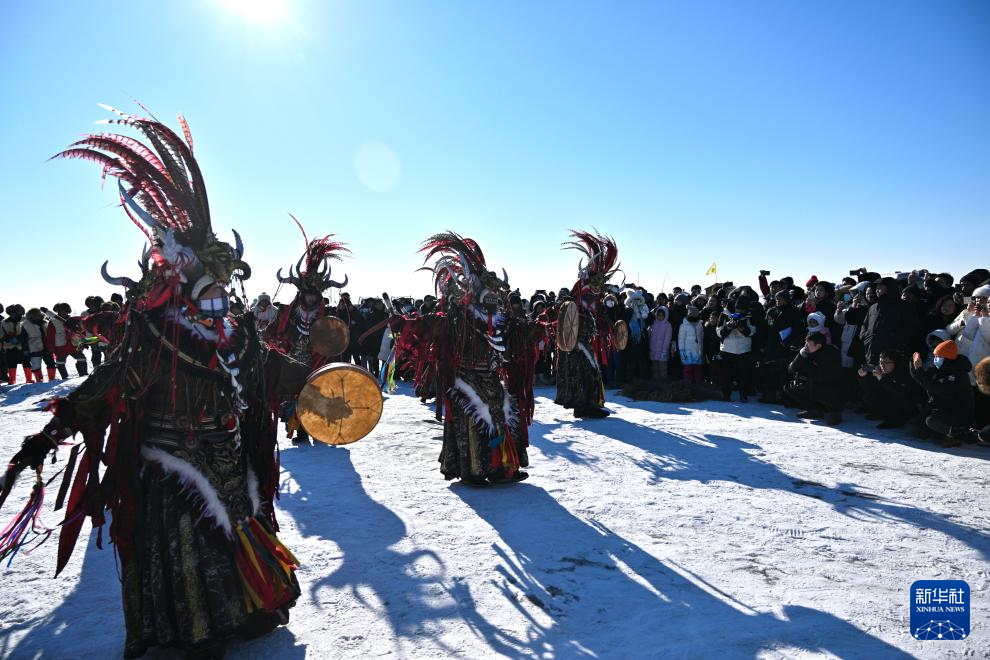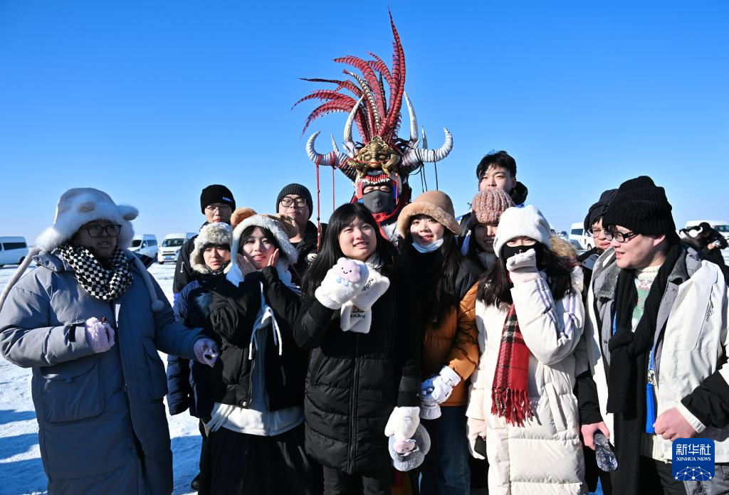 1月24日,冬令营营员在吉林省松原市查干湖观看祭湖醒网仪式。