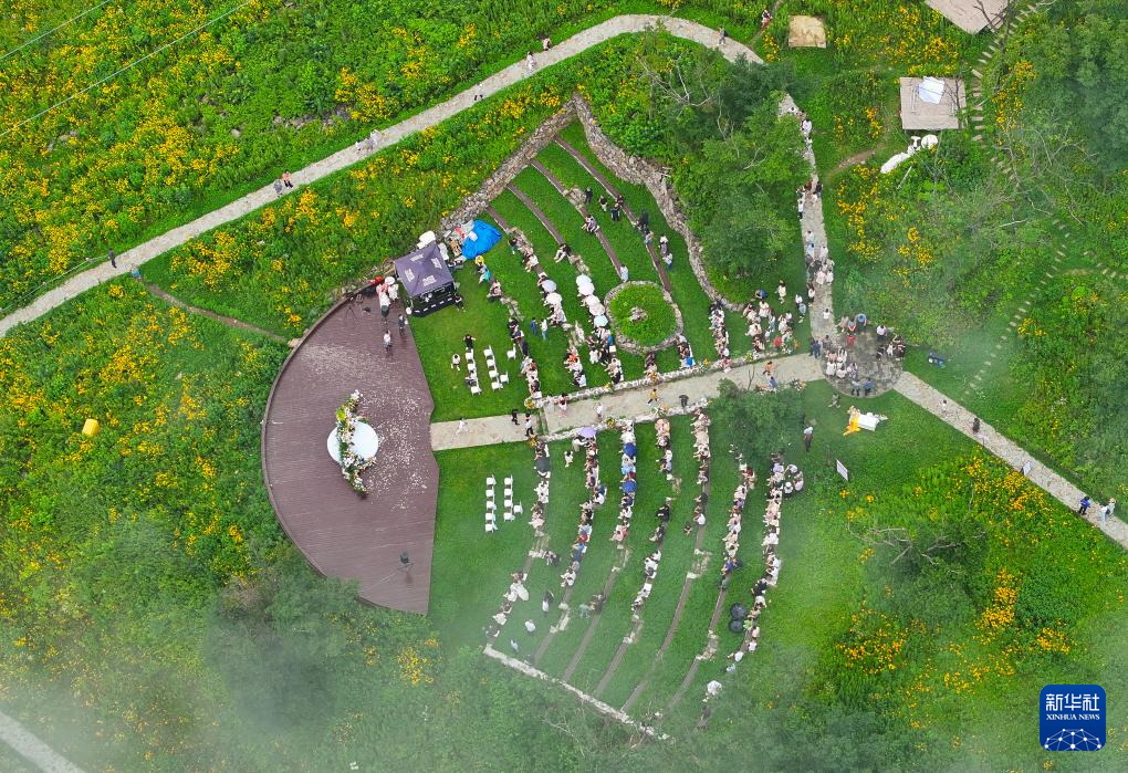 在吉林松花湖滑雪场内,一场婚礼利用山间滑雪道旁的场地举办(无人机照片,8月3日摄)。