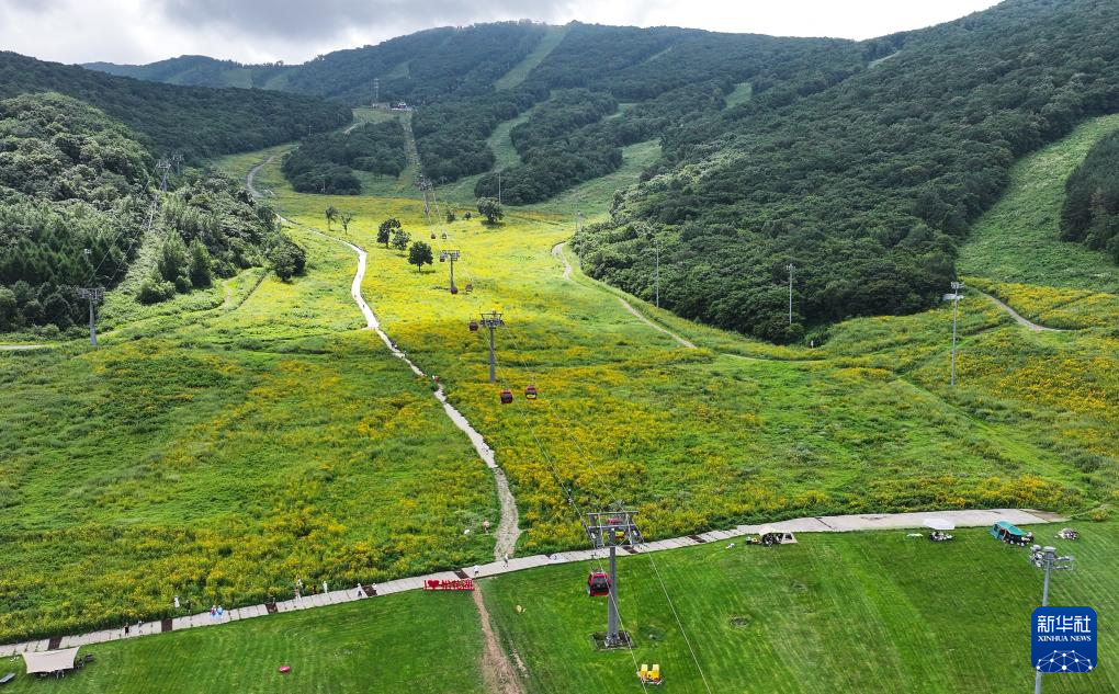 在吉林松花湖滑雪场内,冬季的雪道变身夏季的花海,吸引不少游客前来观光游览(无人机照片,8月3日摄)。