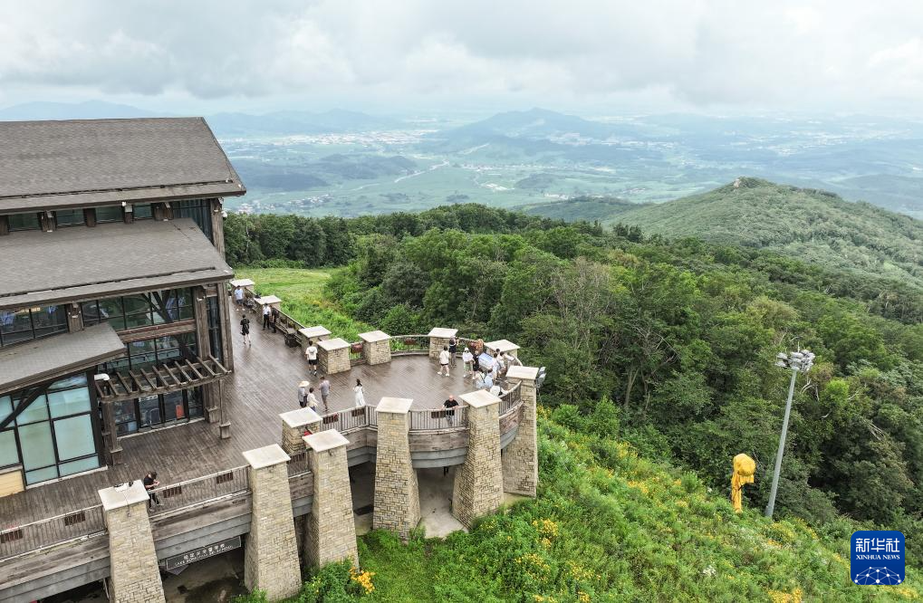 游客们在吉林松花湖滑雪场内游览(无人机照片,8月3日摄)。