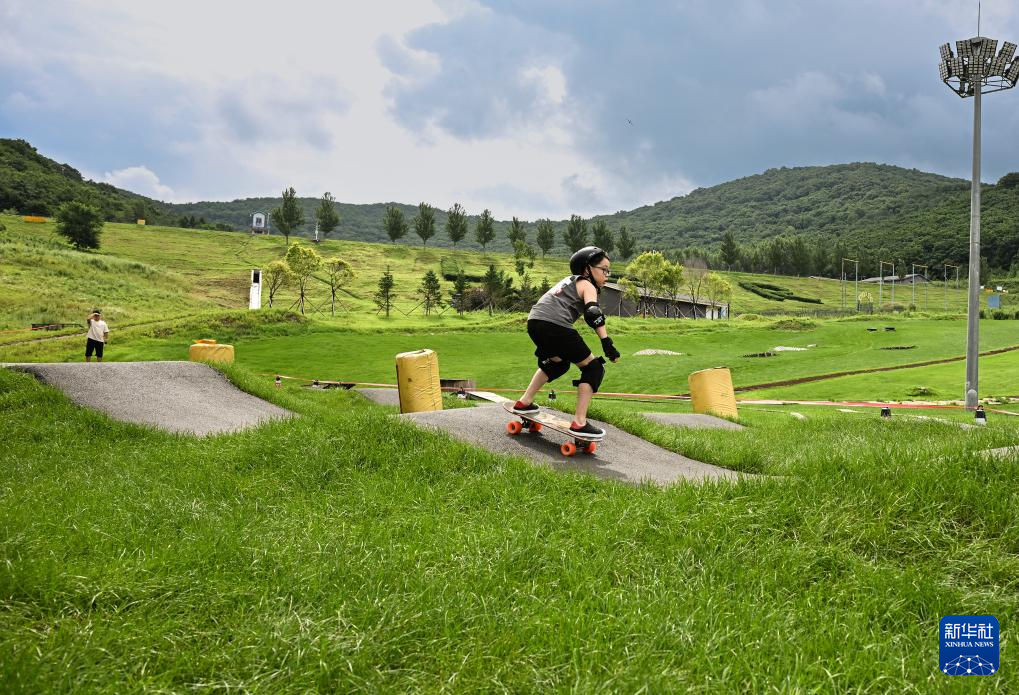 吉林松花湖滑雪场利用场地举行滑板活动,吸引许多小滑手来到这里竞技(8月3日摄)。