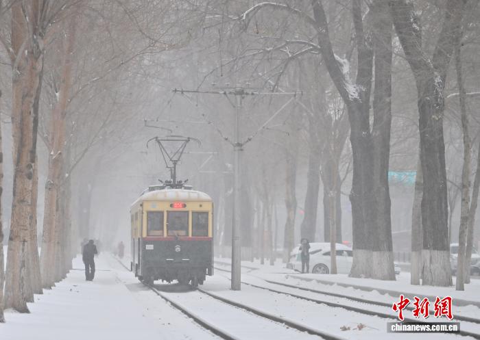 图为54路有轨电车在雪中行驶。中新社记者 张瑶 摄