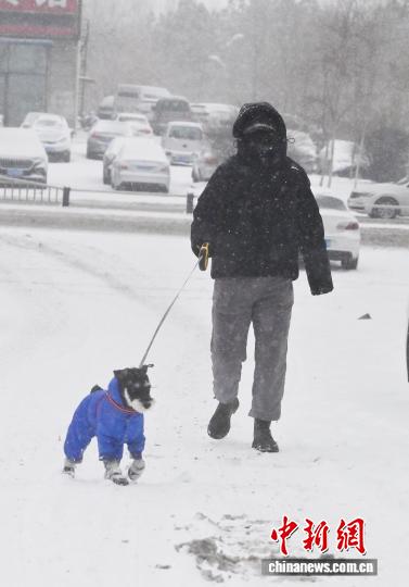 图为小狗身穿羽绒服跟随主人冒雪出行。中新社记者 张瑶摄