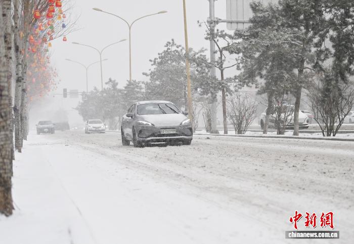 图为车辆冒雪出行。 中新社记者 张瑶 摄