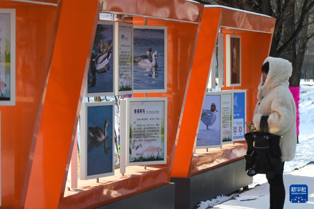 1月28日,游客在长白岛浏览鸟类宣传海报。