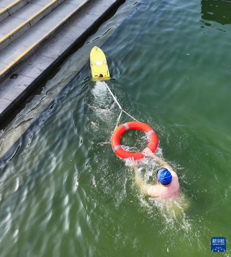 8月12日,在海陵区东河小游船码头水域,遥控救援船将参与演练的人员“救”到岸边(无人机照片)。