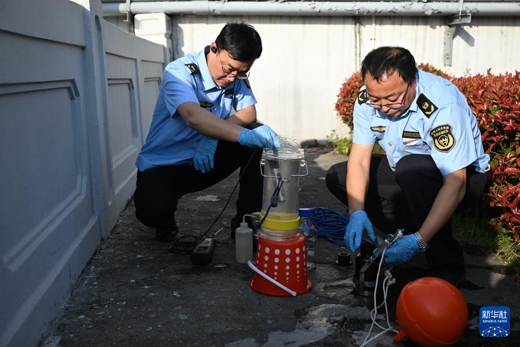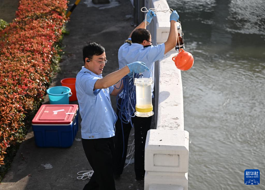 3月25日,扬州市江都生态环境局工作人员在引水上游取样监测。
