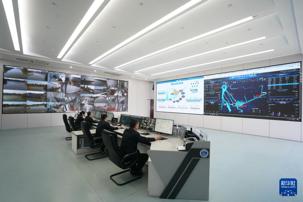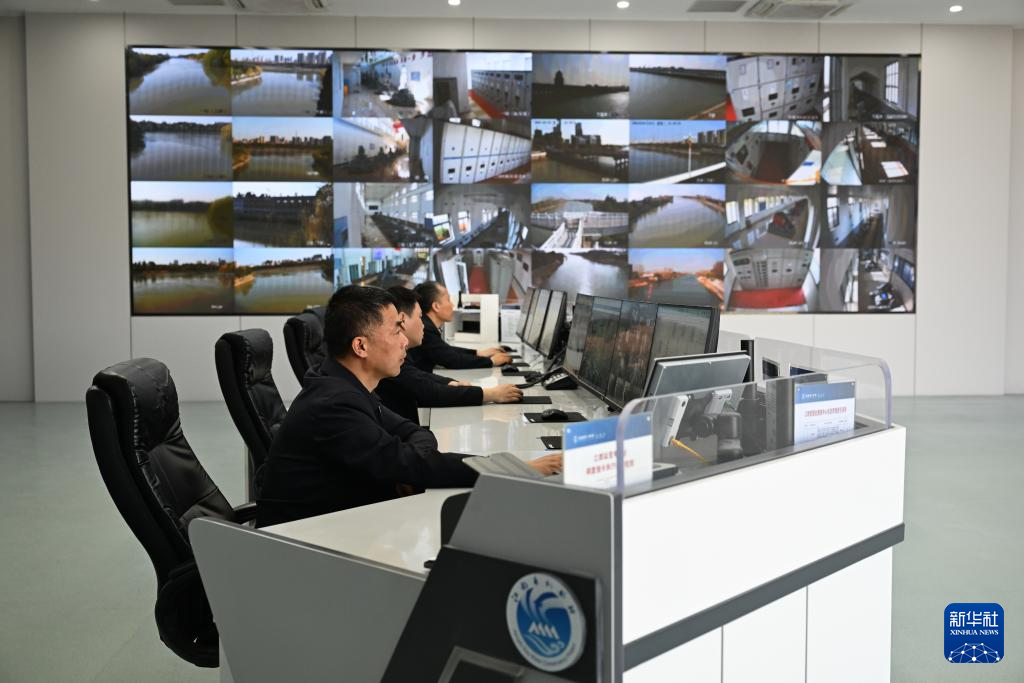3月25日,江都水利枢纽工作人员在集中调度控制中心监测工程运行工况。