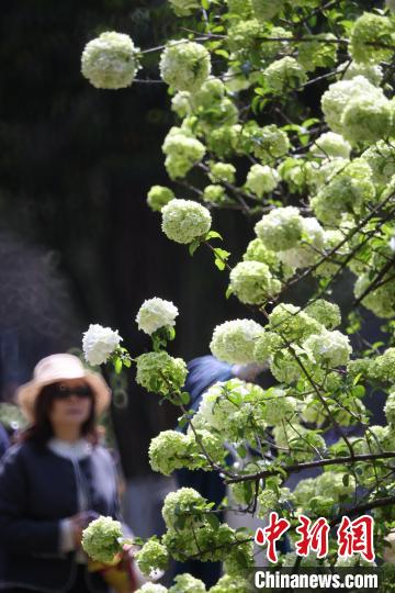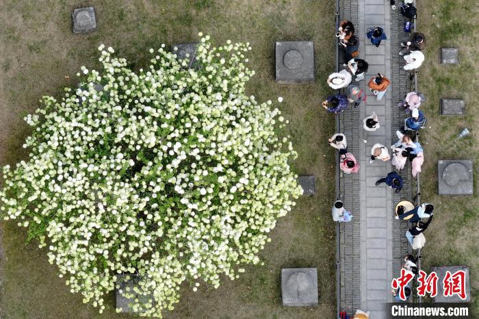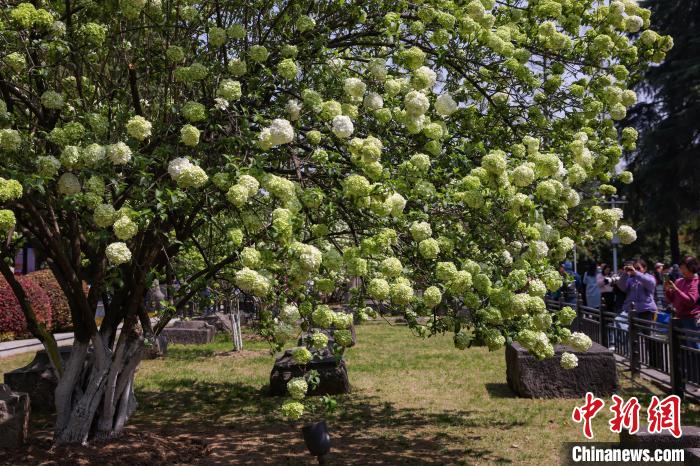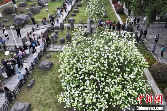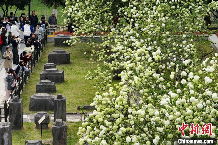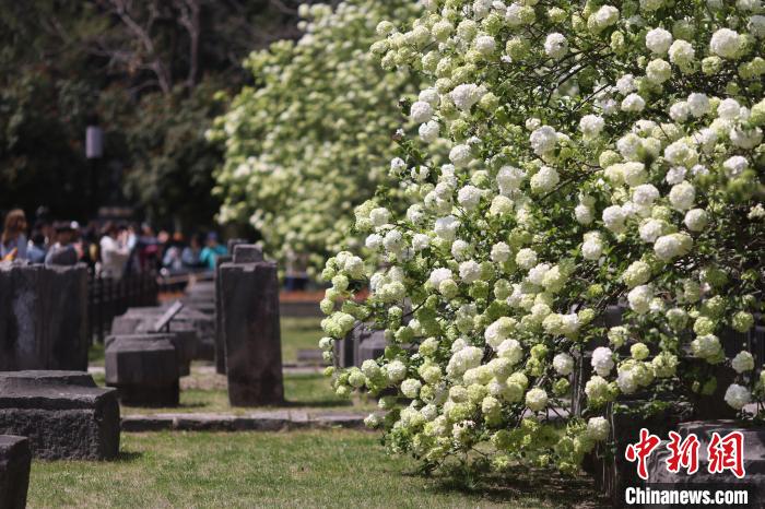 3月31日,江苏南京,明故宫遗址午朝门公园内木绣球“清新”上线,白色花朵团团簇簇缀满枝头,与600多年历史的古老遗址相得益彰,吸引了市民前来感受春日的静谧与美好。中新社记者泱波 摄