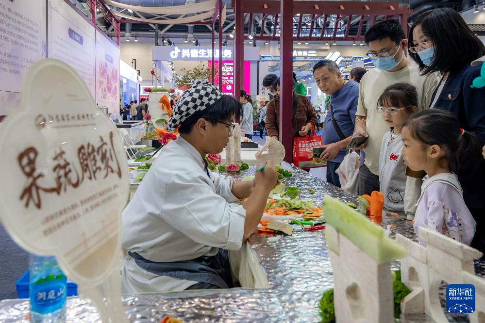 10月18日,小朋友在博览会上观看果蔬雕刻演示。