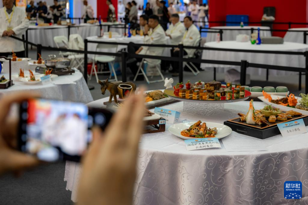 10月18日,观众在博览会上拍摄展出的菜品。