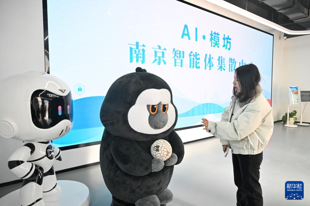 12月4日,在南京人工智能生态街区的“AI·模坊”南京智能体集散中心,工作人员与智能移动终端互动。