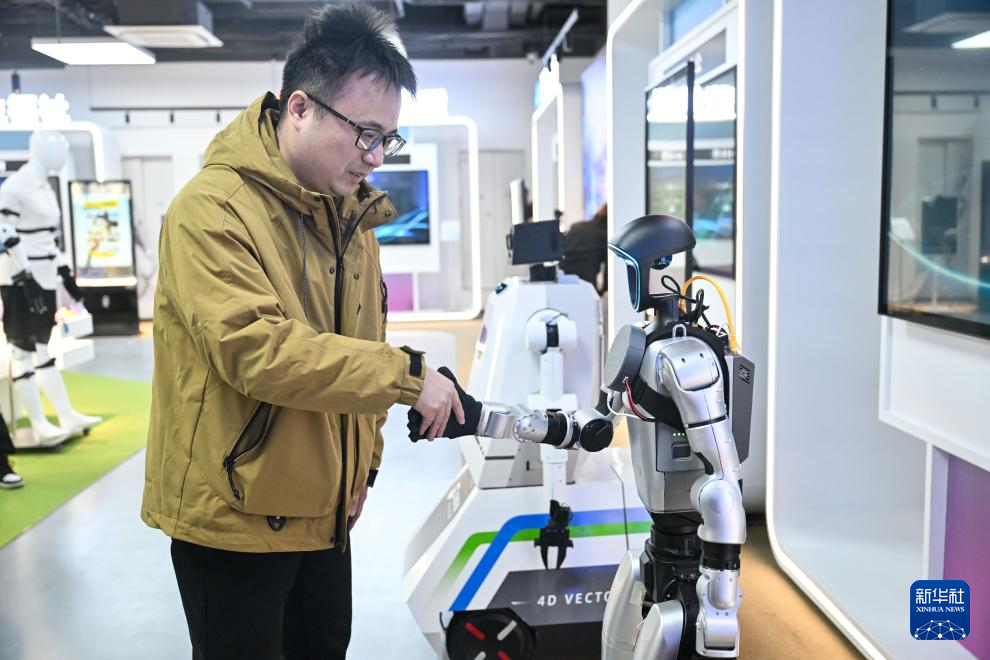 12月4日,在南京人工智能生态街区的“AI·模坊”南京智能体集散中心,一款华夏机器人在打招呼。