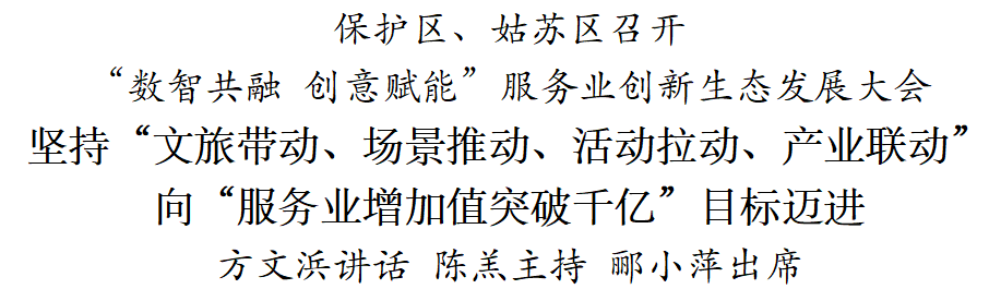 1月6日,保护区、姑苏区召开“数智共融创意赋能”服务业创新生态发展大会,深入学习贯彻党的二十届四中全会、中央经济工作会议精神和习近平总书记对江苏、苏州工作重要讲话重要指示精神,紧扣省委、市委经济工作会议和市新型工业化推进会议暨“AI+制造”创新发展大会部署,动员全区锚定“服务业增加值突破千亿”工作目标,坚持“文旅带动、场景推动、活动拉动、产业联动”,以“开局即冲刺、起步即决战”的奋进姿态,全力推动服务业向高端化、数字化、融合化方向迈进,用“开门红、全年好”的工作实绩,为“十五五”发展奠定坚实基础。保护区党工委书记、姑苏区委书记方文浜出席并讲话,保护区管委会主任、姑苏区政府区长陈羔主持会议。区人大常委会主任郦小萍,保护区党工委副书记、姑苏区委副书记谢强出席会议。