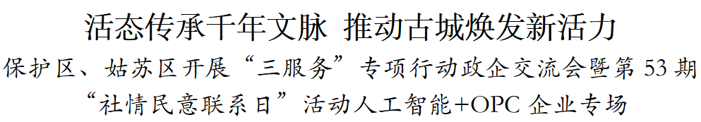 方文浜指出,大力发展以人工智能为代表的新质生产力,是保护区、姑苏区实现“十五五”良好开局的重要机遇。要提高思想站位,全面落实“保护好、挖掘好、运用好”重要要求,坚持“文旅带动、场景推动、活动拉动、产业联动”,发扬“凡事有交代、件件有着落、事事有回音”的靠谱闭环作风,改革创新、担当作为,将古城丰厚的文化底蕴与空间资源,转化为发展人工智能的独特优势。要持续深化“三服务”专项行动,依托“社情民意联系日”机制,办好企业(经营主体)专场活动、政企早餐会,常态化开展政企午餐会,针对企业反映的政策、融资、人才等共性需求,拿出更多“雪中送炭”的个性化解决方案,全力以赴做好全周期、全链条服务,打响“古城全域OPC”特色品牌。要推动政企协同发力,畅通政企交流平台,持续优化“人工智能+”产业生态,推动数据集、大模型、应用场景等创新要素高效对接。办好即将在姑苏区举办的第三届全国人工智能应用场景创新挑战赛全国总决赛,吸引更多全球优秀的创业者和创新项目汇聚姑苏,让千年古城在新时代的数智浪潮中,活态传承千年文脉,推动古城焕发新活力。