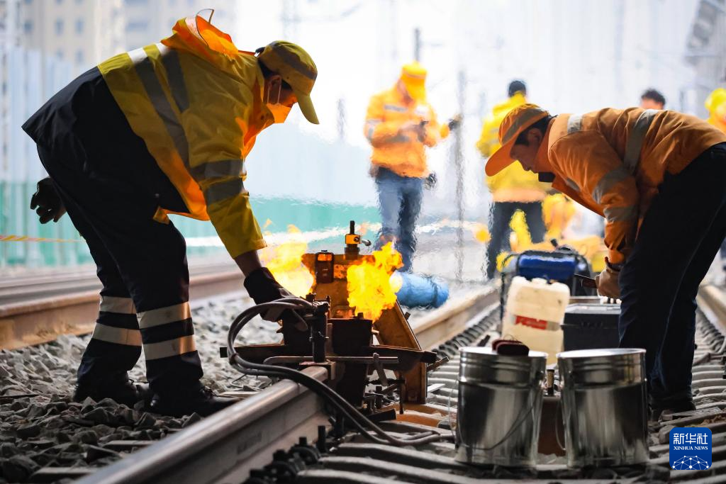 3月16日,铁路职工在京沪铁路南京林场站进行钢轨焊接作业。