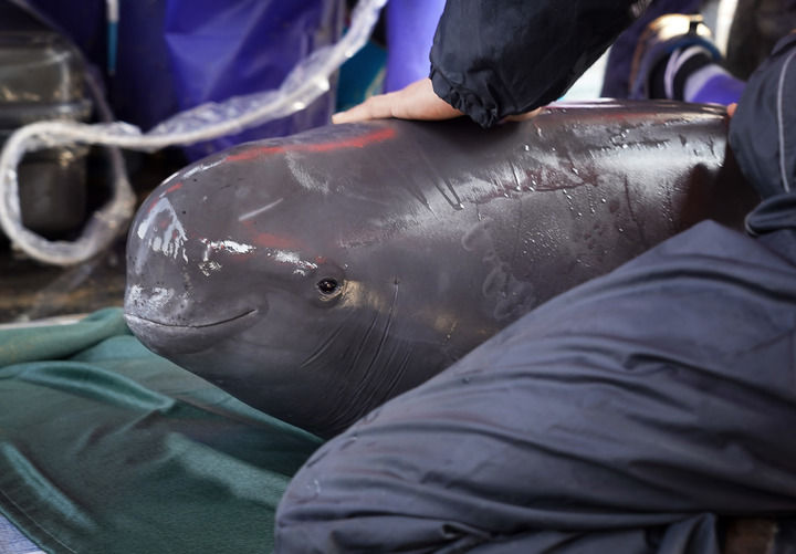 在江西鄱阳湖松门山水域,科研人员一边为江豚体检,一边用手安抚。当天,江西省在鄱阳湖松门山水域联合开展长江江豚迁地保护行动(2023年2月15日摄)。新华社记者万象 摄