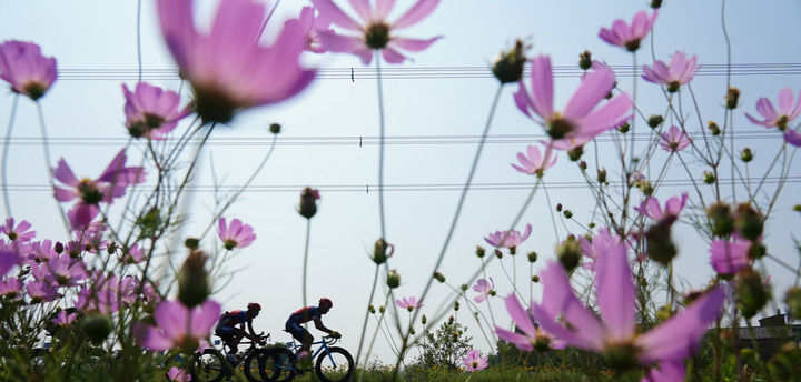 环鄱阳湖国际自行车赛在江西省南昌市高新区鄱阳湖畔举行,自行车选手正在骑行中(2019年9月28日摄)。新华社记者 周密摄