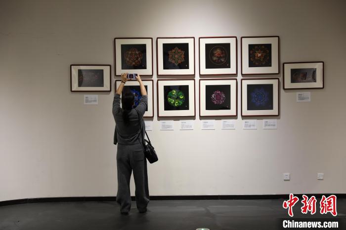 12月17日,中国纸上刀绘艺术作品展在沈阳博物馆展出,此次展览集中展示了王静的约40幅纸上刀绘精品力作。图为观众在观看展出的作品《和谐共生曲》。中新社记者于海洋 摄