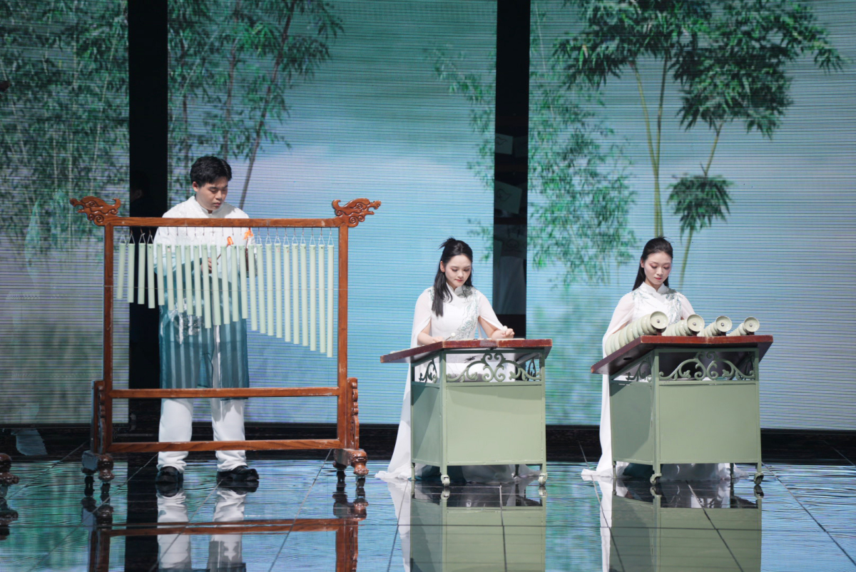 三江汇流,因水而兴。紧接着,瓯乐《水之韵》焕新呈现。“一滴大自然,一捧三江魂”“闻水听音,见泉思韵”……迤逦千年的水盏之乐与吟诵、渔歌号子结合,展开一幅具有中式美学特色的风雅长卷,将宁波的山海生态之美尽收其中。
