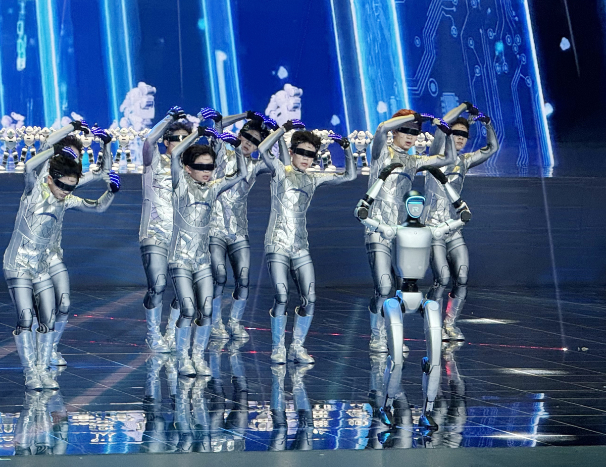如人机表演唱《AI上春晚》,经过编程,多台机器人、机器狗来到台前“舞动”身姿,并成功作出“挥手”“比心”等动作,与观众互动,将现场气氛推至高潮。结合升降舞台、空中威亚,人机共舞形成多层次的表演空间,科技感十足。