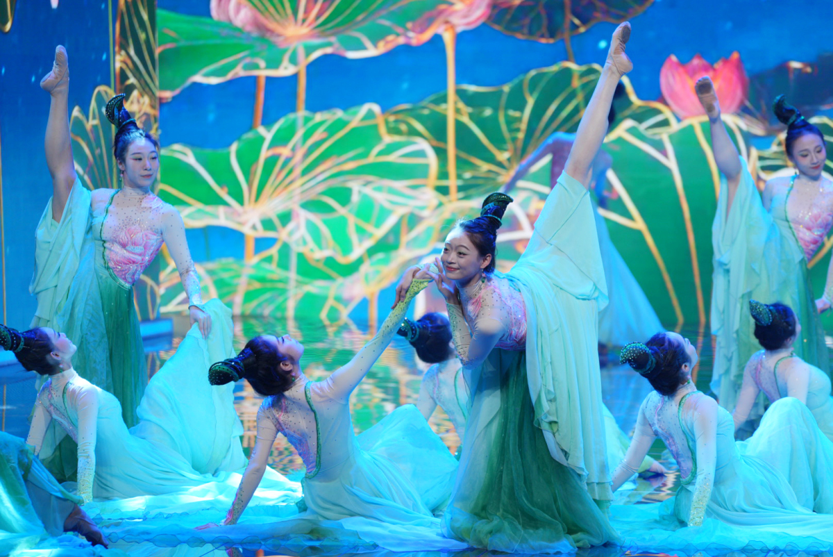 豪情在海上,诗情在江南。随后登场的是女子群舞《如·荷》。环绕式数字屏、机械舞台、威亚与AI虚拟技术共同营造出一朵朵“小荷”从水中生长出根茎、枝蔓的动态效果,而后满池“清荷”宁静绽放,迎风摇曳,亭亭玉立,予世人以祝福。