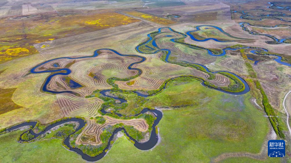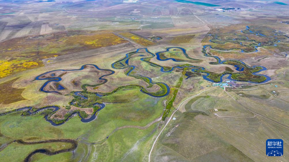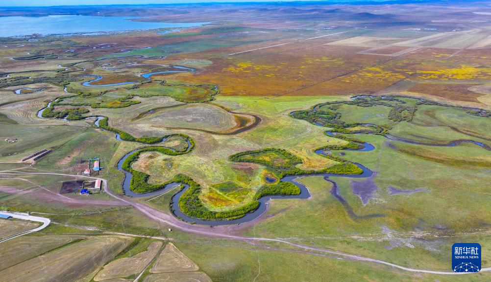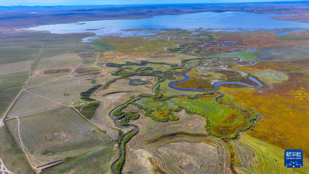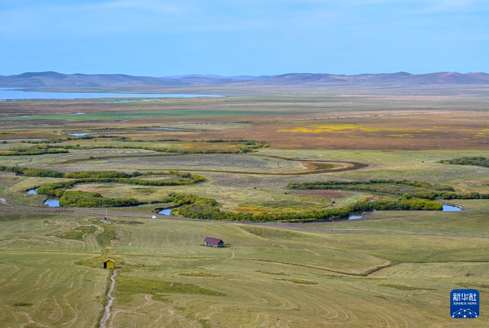 秋日,位于内蒙古锡林郭勒盟东北部的乌拉盖草原色彩斑斓,蔚蓝色的天幕下,河水蜿蜒流淌,草原披上“秋装”。