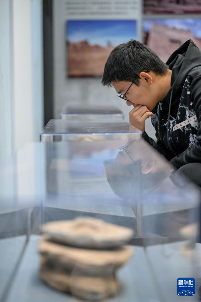 10月2日,游客在好汉山明长城国家文化公园内参观展出的文物。