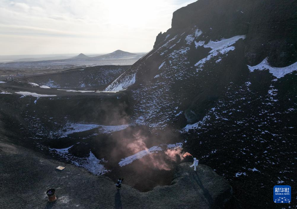 2025年1月1日,游人在乌兰哈达火山群6号火山游玩(无人机照片)。