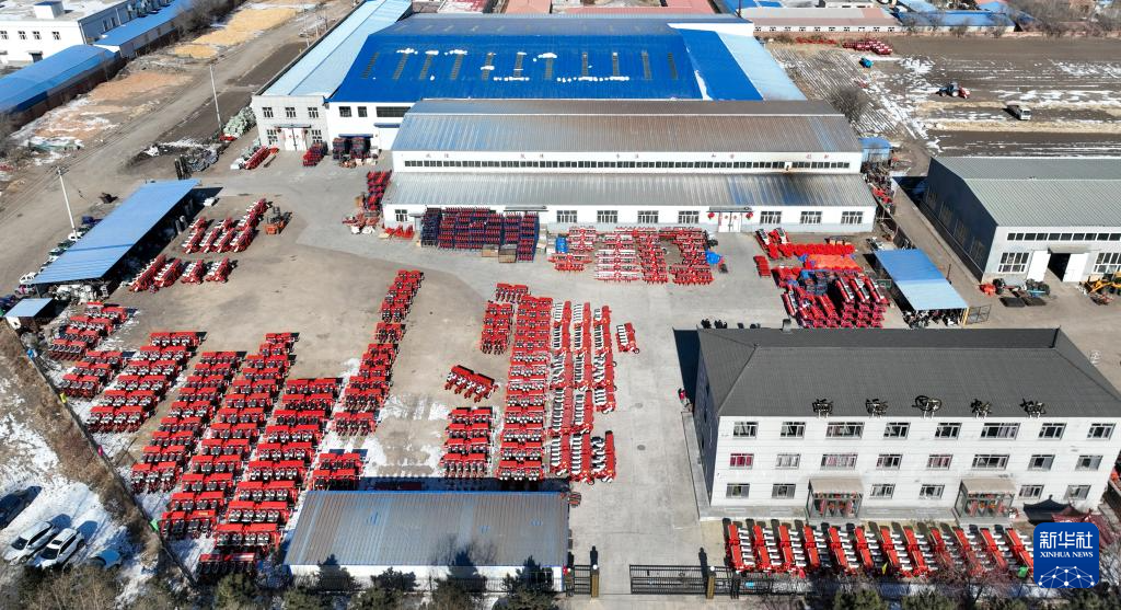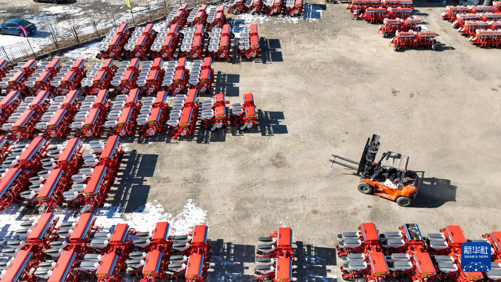 这是2月22日在内蒙古兴安盟乌兰浩特市顺源农牧机械制造有限公司拍摄的播种机(无人机照片)。
