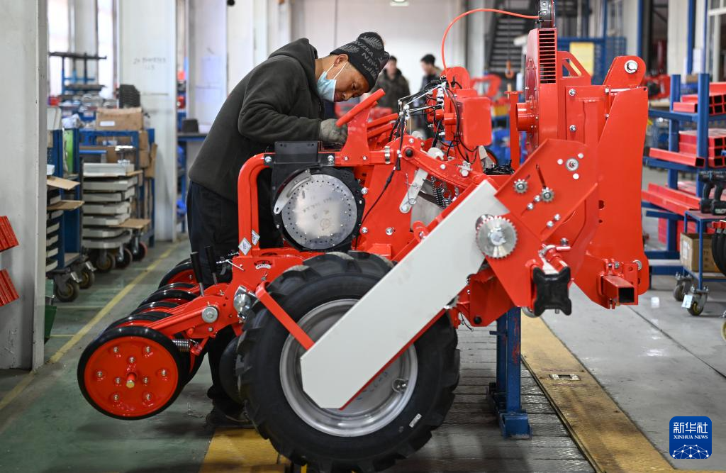 2月22日,工人在内蒙古兴安盟乌兰浩特市顺源农牧机械制造有限公司生产车间装配播种机。