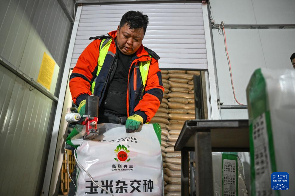 2月22日,工人在内蒙古兴安盟乌兰浩特市兴丰种业有限公司生产车间封装玉米种子。