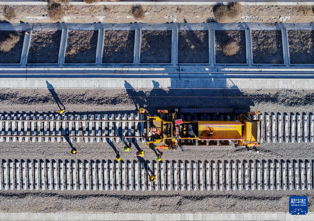 2月22日,施工人员在包银高铁内蒙古包头至临河区段进行铺轨作业。