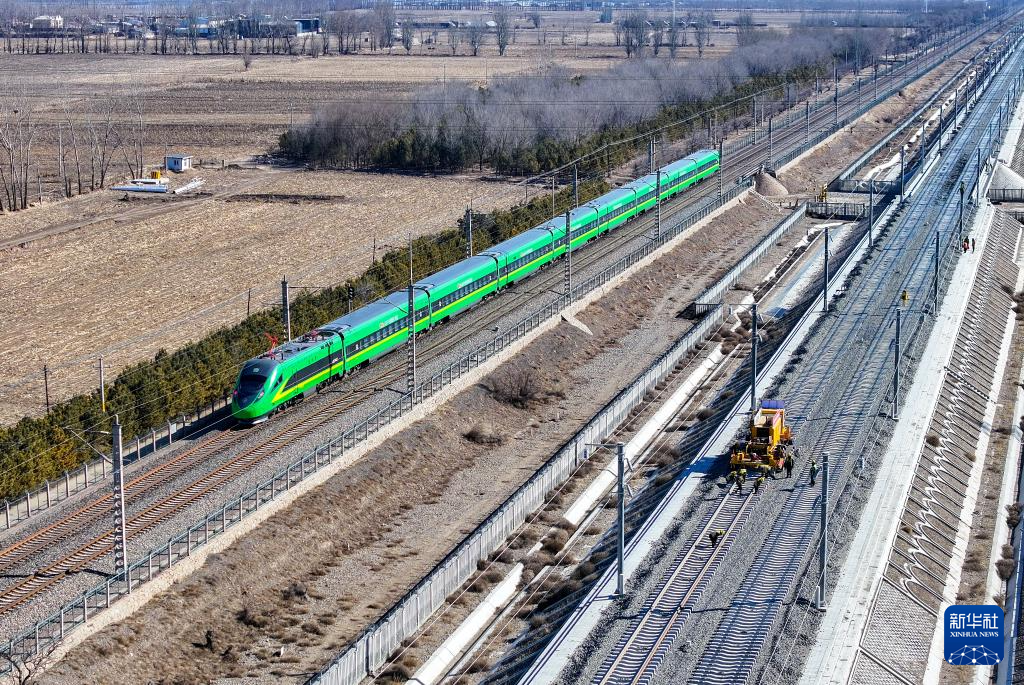 2月22日,施工人员在包银高铁内蒙古包头至临河区段进行铺轨作业(无人机照片)。