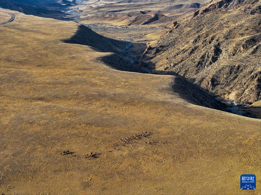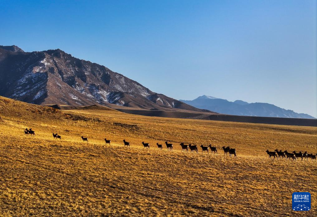 3月19日,在内蒙古贺兰山国家级自然保护区内拍摄的马鹿(无人机照片)。