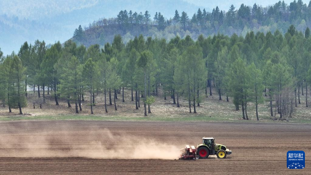 5月21日,在位于扎兰屯市的呼伦贝尔农垦绰尔河农牧场,工作人员驾驶农机播种大豆。