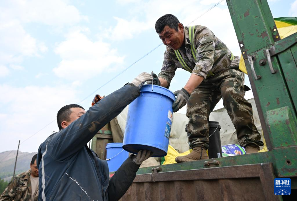 5月21日,在位于扎兰屯市的呼伦贝尔农垦绰尔河农牧场,工作人员在搬运大豆种子。